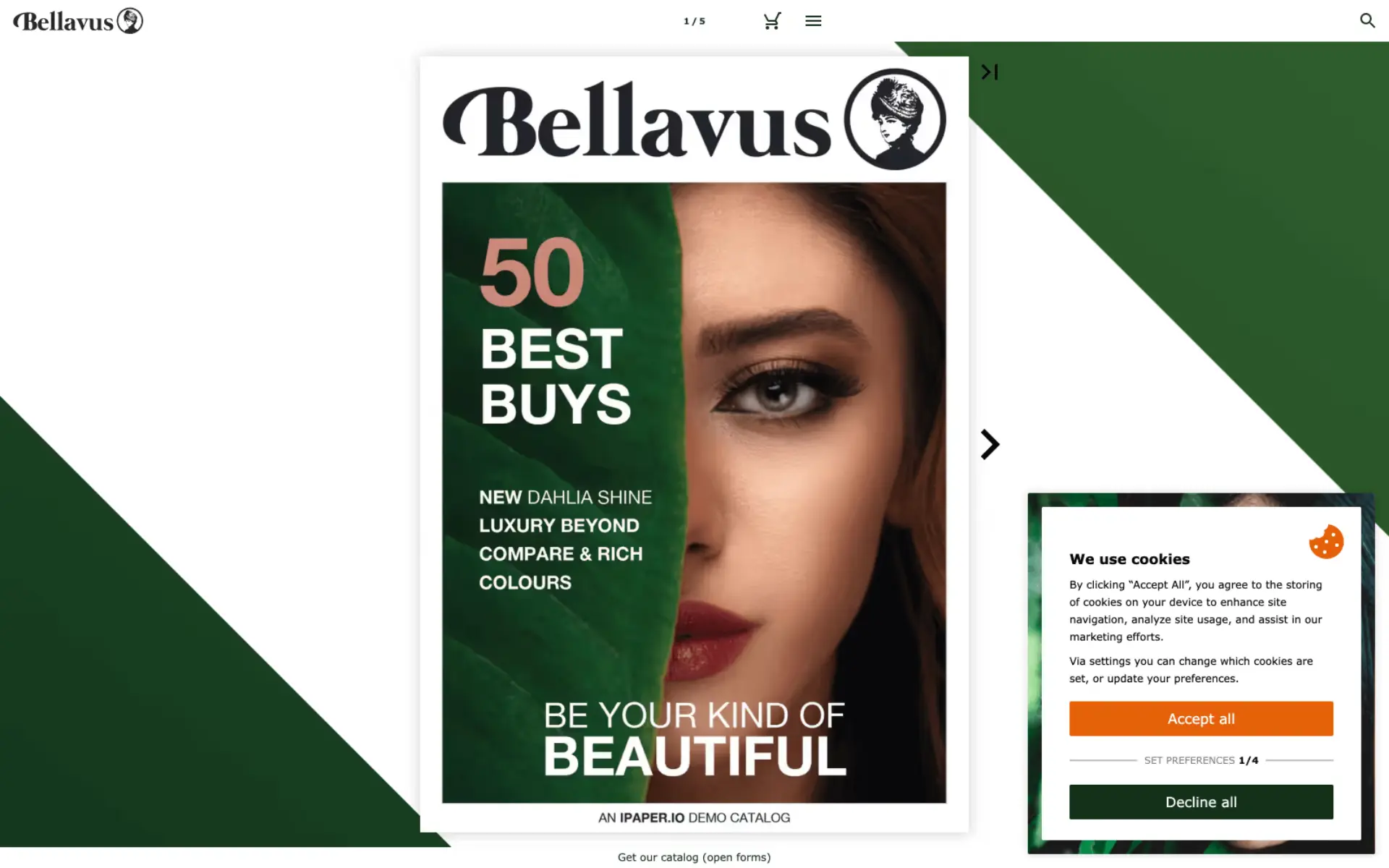 Comply with EU cookie laws and add a cookie banner to your digital catalogs. We support different behaviors and you can choose between a default to accept all cookies or a default to block all cookies.