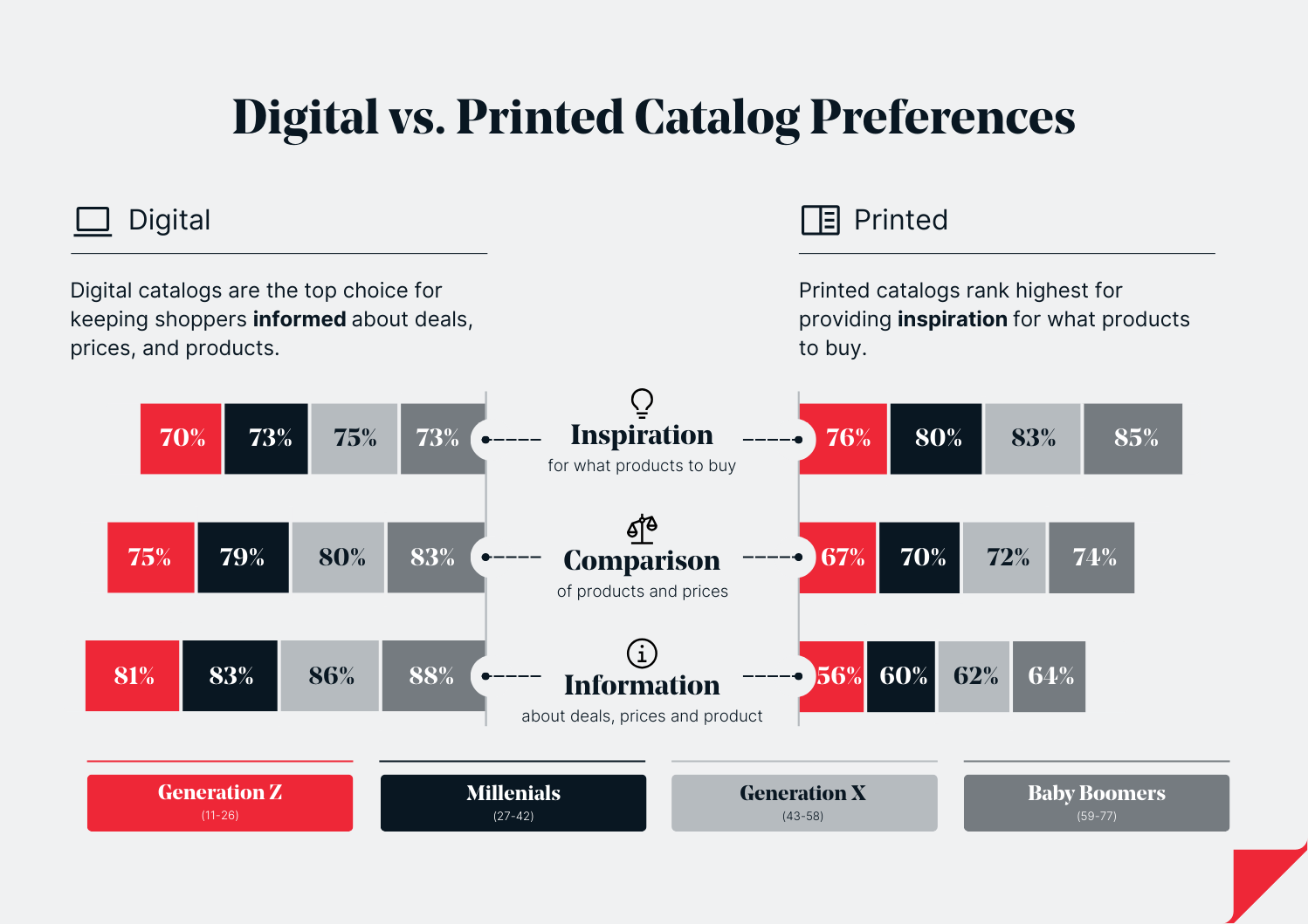 Digital catalogs excel in providing up-to-date, searchable, and interactive information, making them ideal for staying informed about deals and prices. In contrast, printed catalogs offer a tactile, visually appealing, and curated browsing experience that is well-suited for inspiration. The preferences of different generations reflect their familiarity and comfort with each medium, influencing how they use catalogs in their shopping journeys.