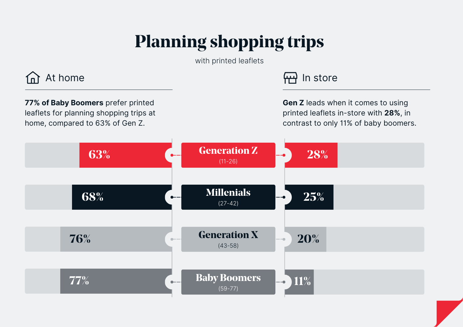 Printed catalogs remain a valuable tool for many consumers. According to the survey, 77% of Baby Boomers like to use printed leaflets to plan their shopping trips at home and, generationally, are most likely to use them for this purpose, as opposed to only 63% of Gen Z users. Conversely, Gen Z leads when it comes to using printed leaflets in-store with 28%, in contrast to only 11% of baby boomers.